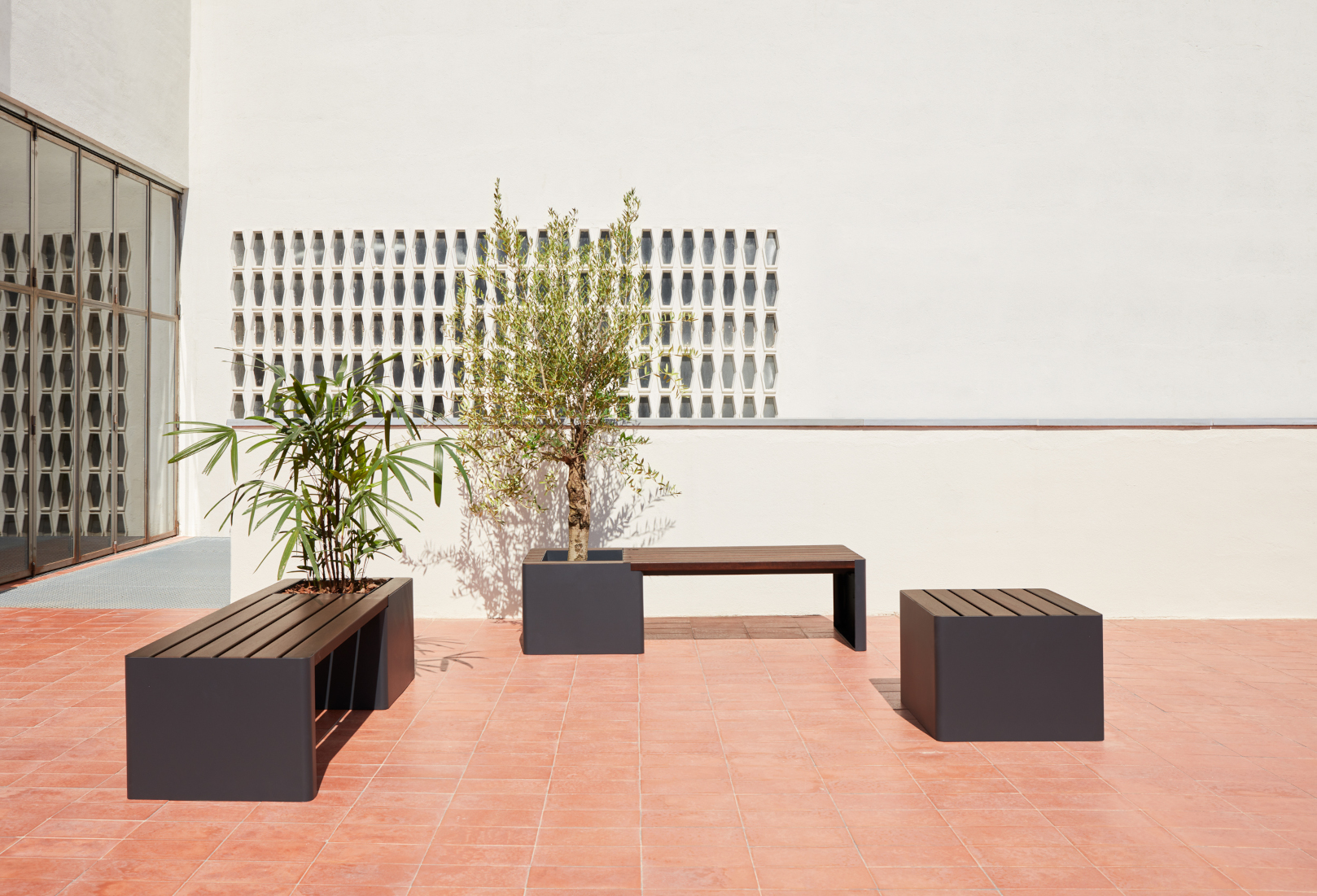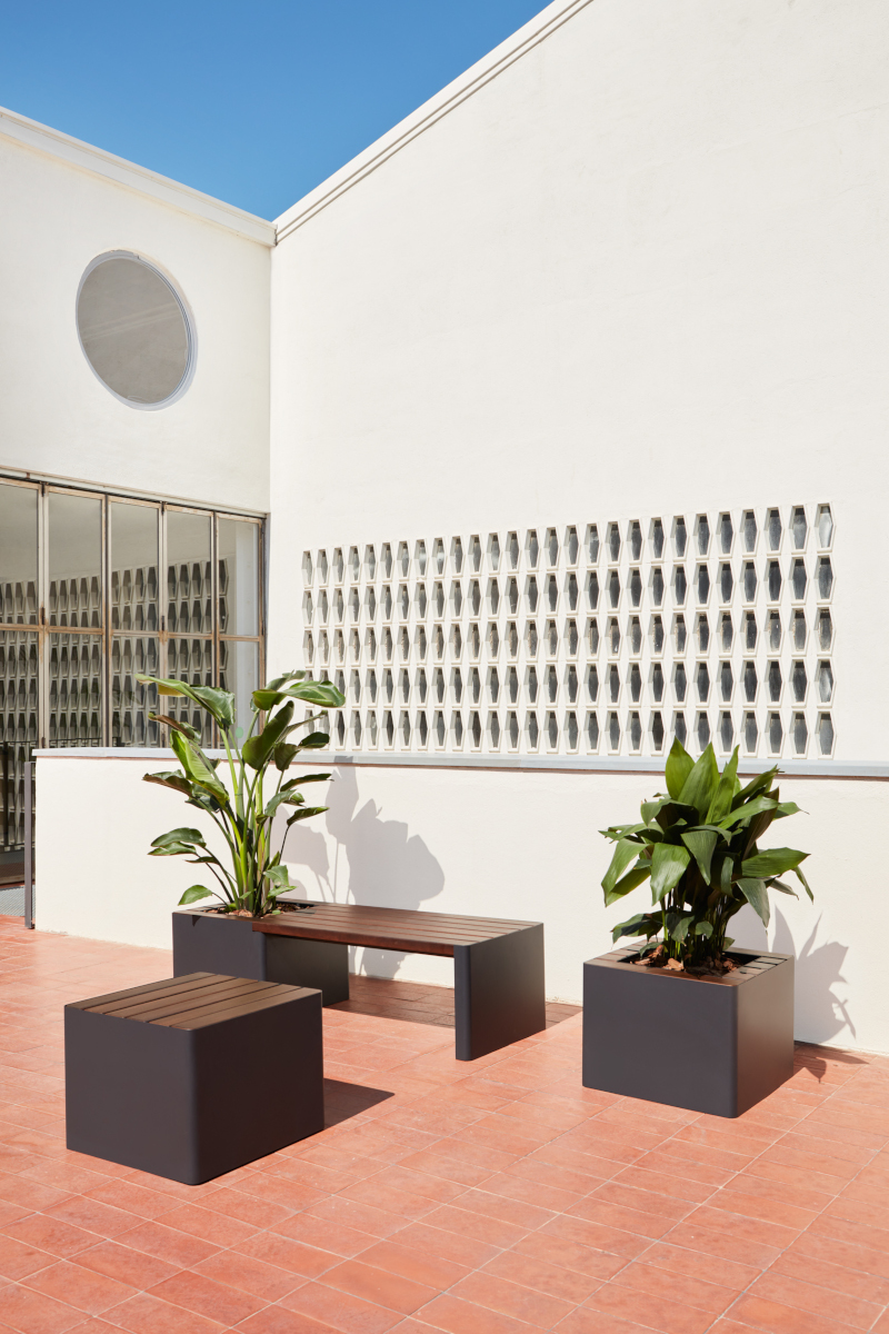 Estructura que combina tubo con chapa metálica y acoge listones de madera de iroko